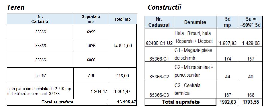 Proprietate imobiliara constituita din teren intravilan cu suprafata totala de 16.913,47 mp format din 15.549 mp compus din 2 loturi: Lot 1 in suprafa?? de 14.831 mp dintre care 1.036 mp drum, iar restul curti constructii si Lot 2 in suprafata de 718 mp curti constructii + suprafata de 1.364,47 mp curti constructii, impreuna cu 3 constructii C1 C3 edificate pe lot 1, avand o suprafata totala de 405 mp si o constructie P+1/E edificata pe terenul de 1.364,47 mp avand o suprafata utila de 1.429,05 mp, impreuna cu platforma betonata de aproximativ 10.000 mp, proprietate situata pe Bdul Dacia, nr. 129, orasul Mioveni, judetul Arges. Terenul este partial imprejmuit si are deschidere la drum de acces identificat cu nr cad 82560 aflat in proprietatea SC Automobile Dacia SA.
